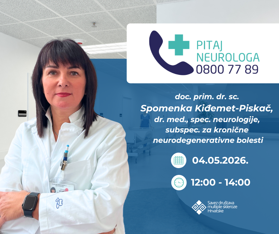 Ukoliko imate pitanja vezana uz liječenje multiple skleroze ili trebate savjet neurologa, 04.05.2026. je na SOS MS telefonu od 12:00 do 14:00 sati dostupna doc. prim. dr. sc. Spomenka Kiđemet-Piskač, dr. med., spec. neurologije, subspec. za kronične neurodegenerativne bolesti.