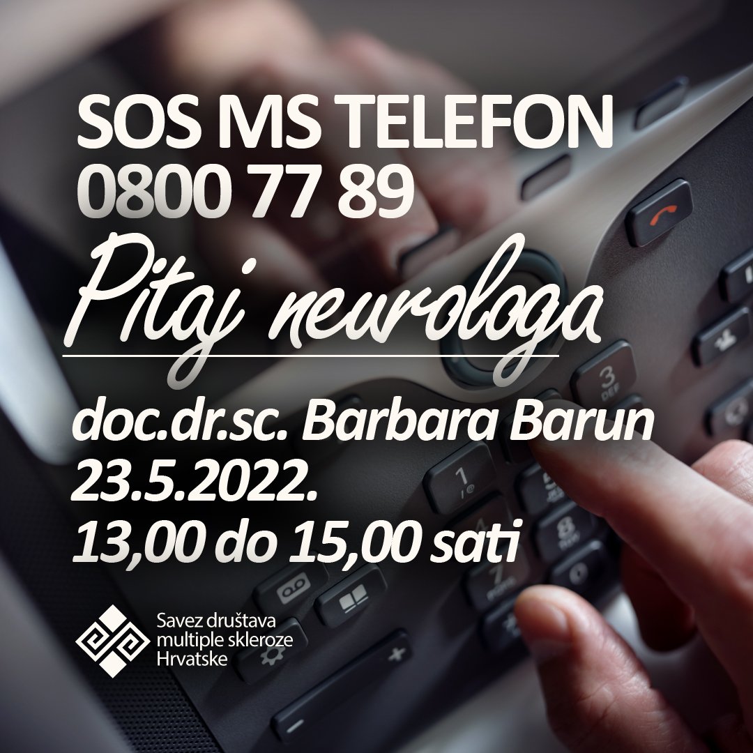 0800 77 89 broj je SOS MS telefona na kojem su u redovitim terminima, dežurni neurolozi na raspolaganju svima koje zanimaju mogućnosti liječenja simptoma multiple skleroze, progresivne bolesti od koje u našoj zemlji, procjenjuje se, boluje gotovo 7000 osoba.