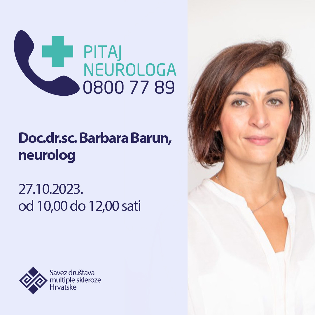 Ukoliko imate pitanja vezana uz liječenje multiple skleroze ili trebate savjet neurologa, 27.10.2023. je na SOS MS telefonu od 10,00 do 12,00 sati dostupna doc.dr.sc. Barbara Barun.