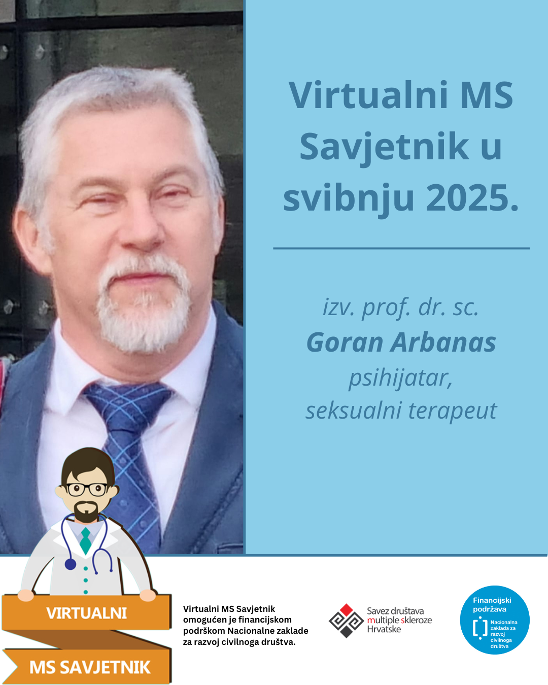 Ukoliko imate pitanje o emocionalnom zdravlju, suočavanju s dijagnozom, odnosima, intimnosti ili promjenama u seksualnosti koje dolaze s MS-om , do kraja mjeseca ga možete postaviti izv. prof. dr. sc. Goranu Arbanasu, psihijatru i seksualnom terapeutu – Virtualnom MS Savjetniku u svibnju, i to putem ovog online obrasca https://bazaznanja.sdmsh.com.hr/virtualni-ms-savjetnik/